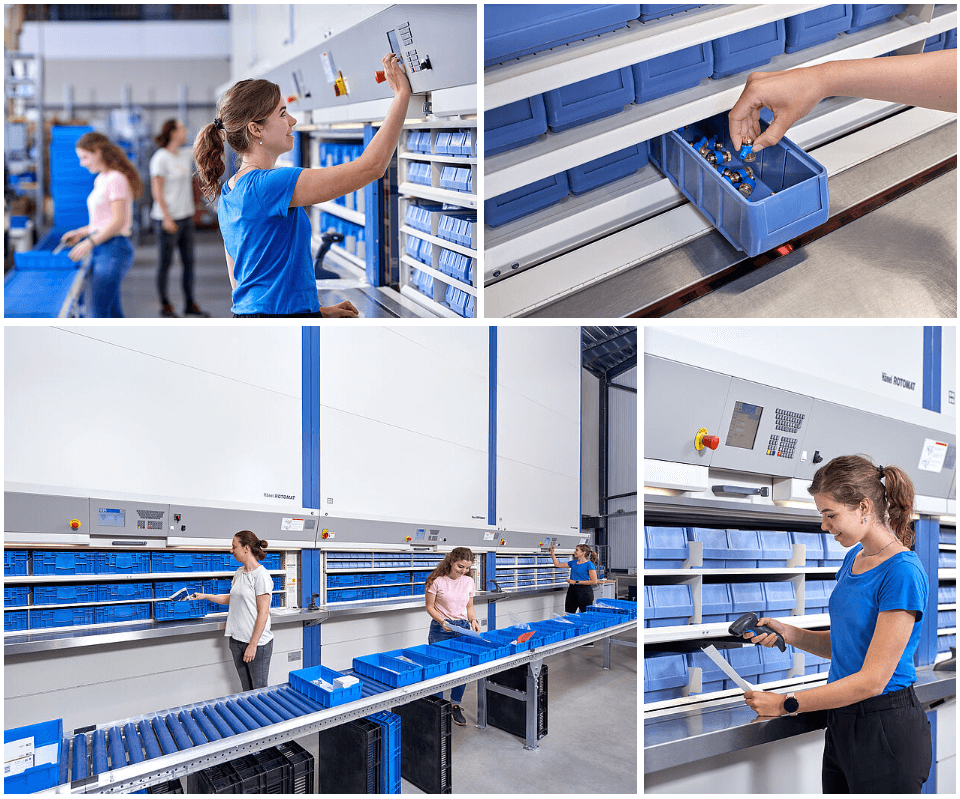 A gép kezelője a vezérlőnél nyugtázza az elkészült csomagokat, és a tételeket a gyűjtődobozba helyezi. Ezzel egyidejűleg a Hänel Rotomat® már a következő megrendelés összeállításán tud dolgozni. A vásárlók rendeléseinek teljesítésén egyszerre több alkalmazott dolgozik a négy raktári automata mellett, ennek köszönhetően hatékonyan és gyorsan tudják átadni a csomagokat a szállítmányozónak.